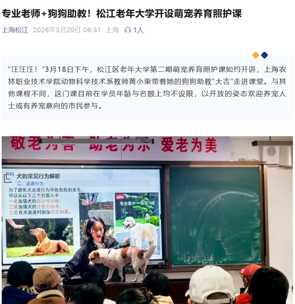 松江区老年大学校长胡莹在采访中表示,此次试开萌宠养育照护课程,既是顺应老龄化社会下老年群体养宠需求日益增长的趋势,前期调研发现大量银发养宠群体缺乏系统科学的养育知识,亟需专业指导;同时得益于学校与上海农林职业技术学院毗邻的区位优势,依托学院动物科学技术系的专业师资优势,能为课程提供专业的教学支撑,真正实现优质教育资源共享、服务地方民生发展。