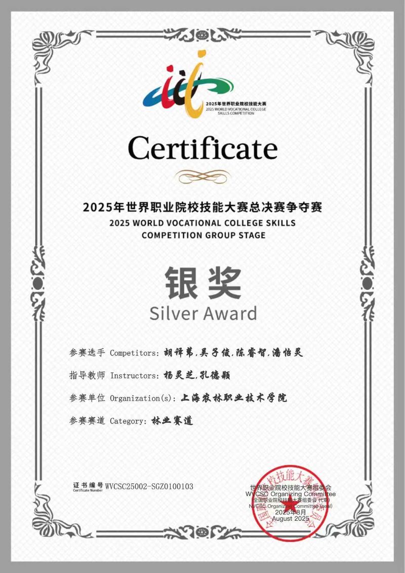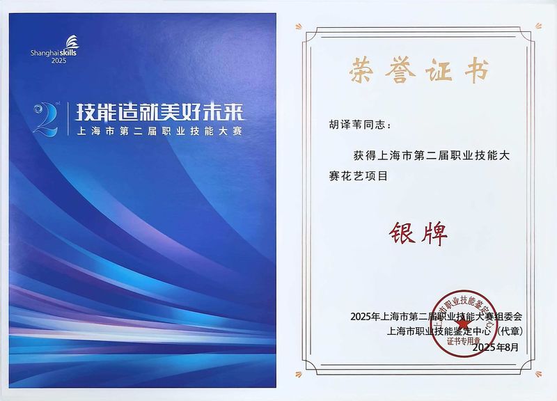 在校期间,胡译苇先后在上海市第二届职业技能大赛(世赛选拔)花艺项目、2025年世界职业院校技能大赛总决赛林业赛道(高职)等高水平赛事中斩获佳绩,以持续稳定的竞技状态和扎实的专业积累,登上国家级技能竞技舞台,赢得行业认可。