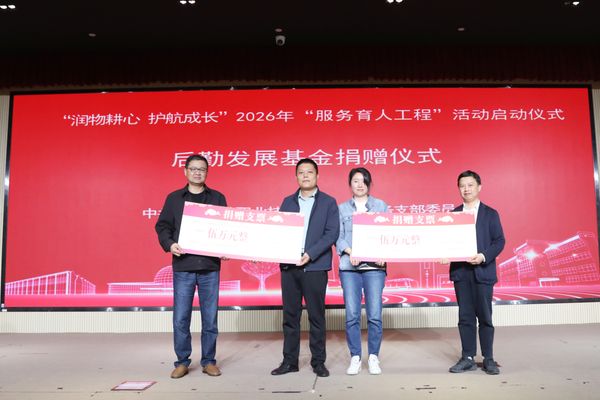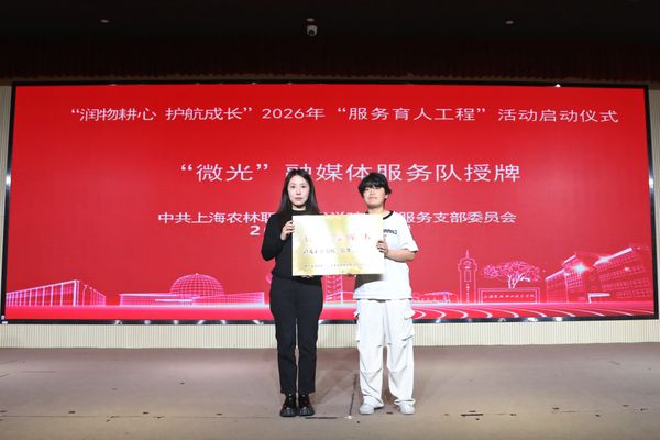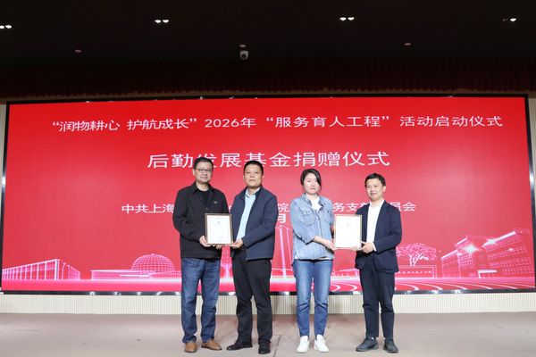 后勤服务党支部书记袁少英详细解读2026年“服务育人工程”活动方案,明确目标任务与实施路径。党委宣传部(统战部)负责人司维为“微光融媒体服务队”授牌,激励团队以新媒体力量传递服务育人正能量。教育发展基金会理事长高功辉、秘书长费明代表学院接受上海强管家安全技术有限公司、上海迪万乐实业有限公司爱心捐赠,并为两家单位颁发捐赠证书。仪式现场,全体人员共同观看环境242团支部“行走的思政课”团课纪实,感受实践育人的鲜活力量。